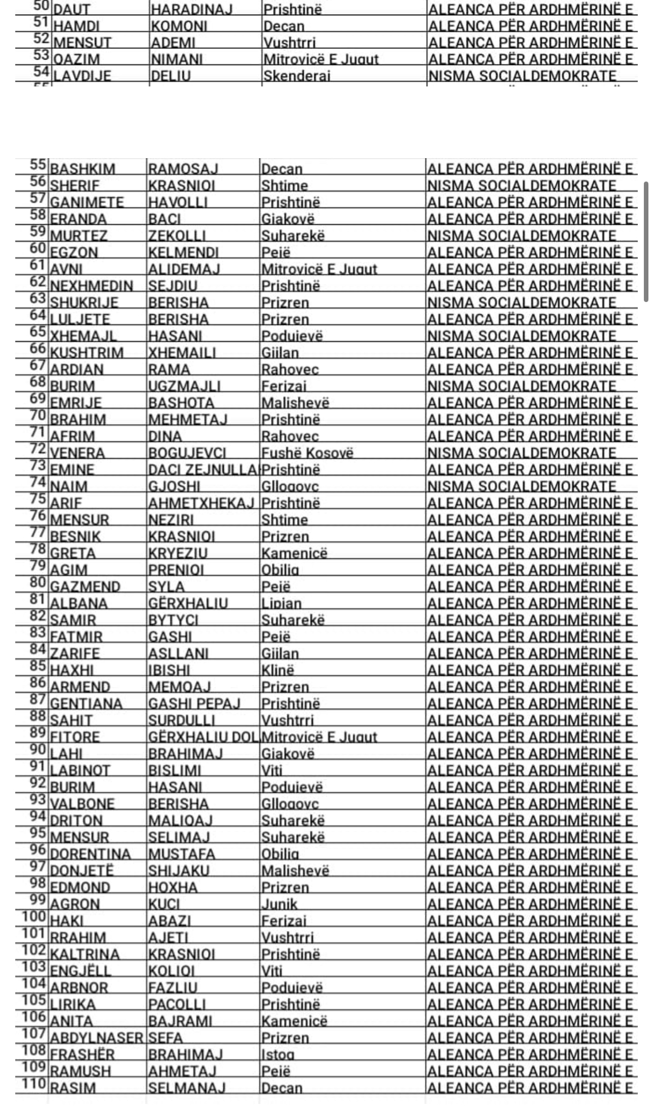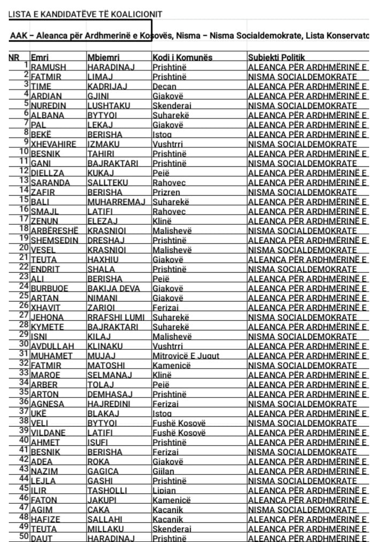 Aleanca për Ardhmërinë e Kosovës para pak minutave ka bërë publike listën e kandidatëve për zgjedhjet e 9 shkurtit.